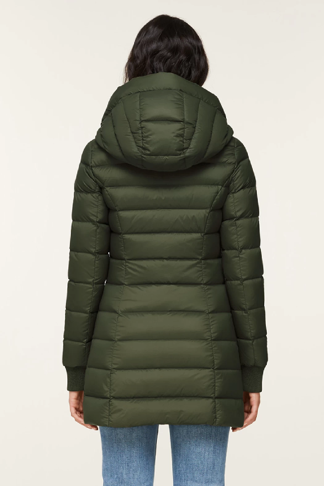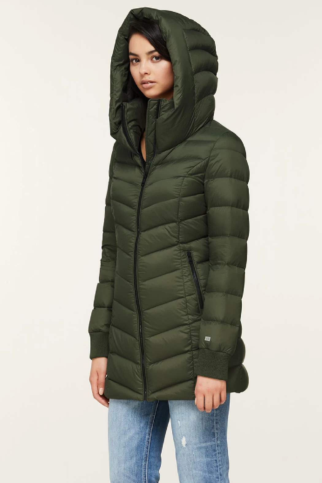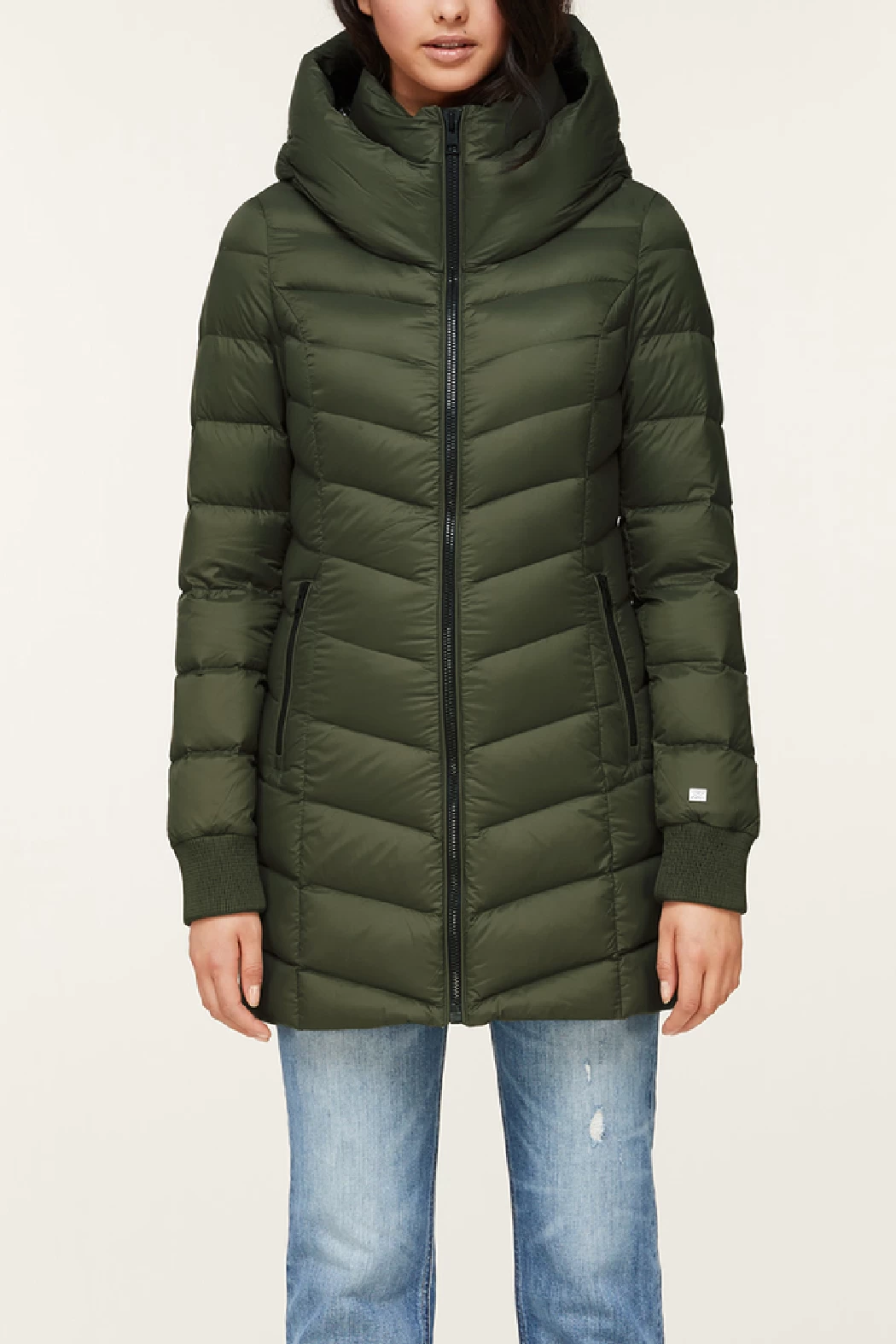 Brave the elements in style with the ALANIS by SOIA & KYO. This slim-fitting, mid-length coat is lightweight and has a water-repellent finish. The down and feather insulation, protective hood, and rib cuffs make it cozy and protective on cold and windy days.