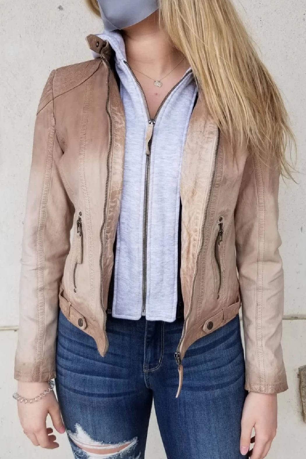 This leather jacket is so edgy and cool, but also made in the softest leather you will ever feel. Great zipper details and comes with a removable grey knit hood. Material does have some natural stretch. This garment runs very small, we recommend sizing up one size if you like it fitted and size up two sizes if you like it relaxed.