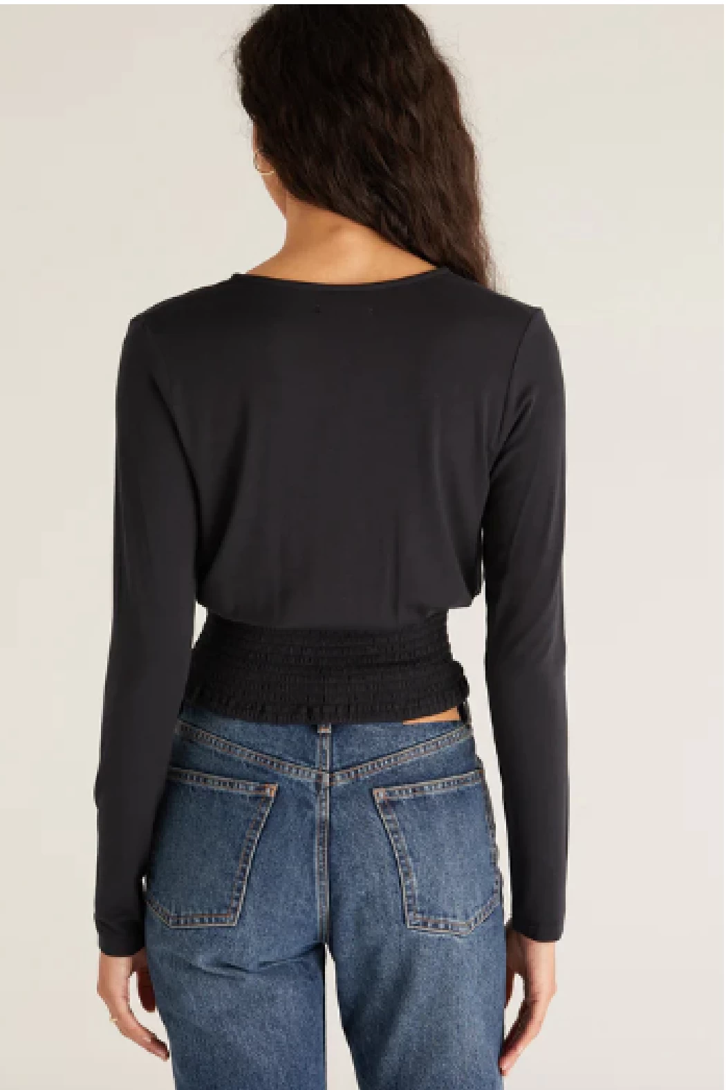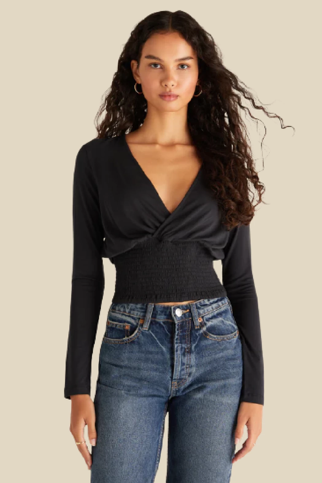 Got a party to go to or a night out planned? You’ll love the flirty and feminine Eliana Smocked Long Sleeve Top to elevate your look, with details like smocking and a crossover v-neck. Made using our signature Modal Spandex fabric, this chic top hits at the top of the waistband and bloussants over. Pair it with a high rise style and you’ll definitely turn some heads!