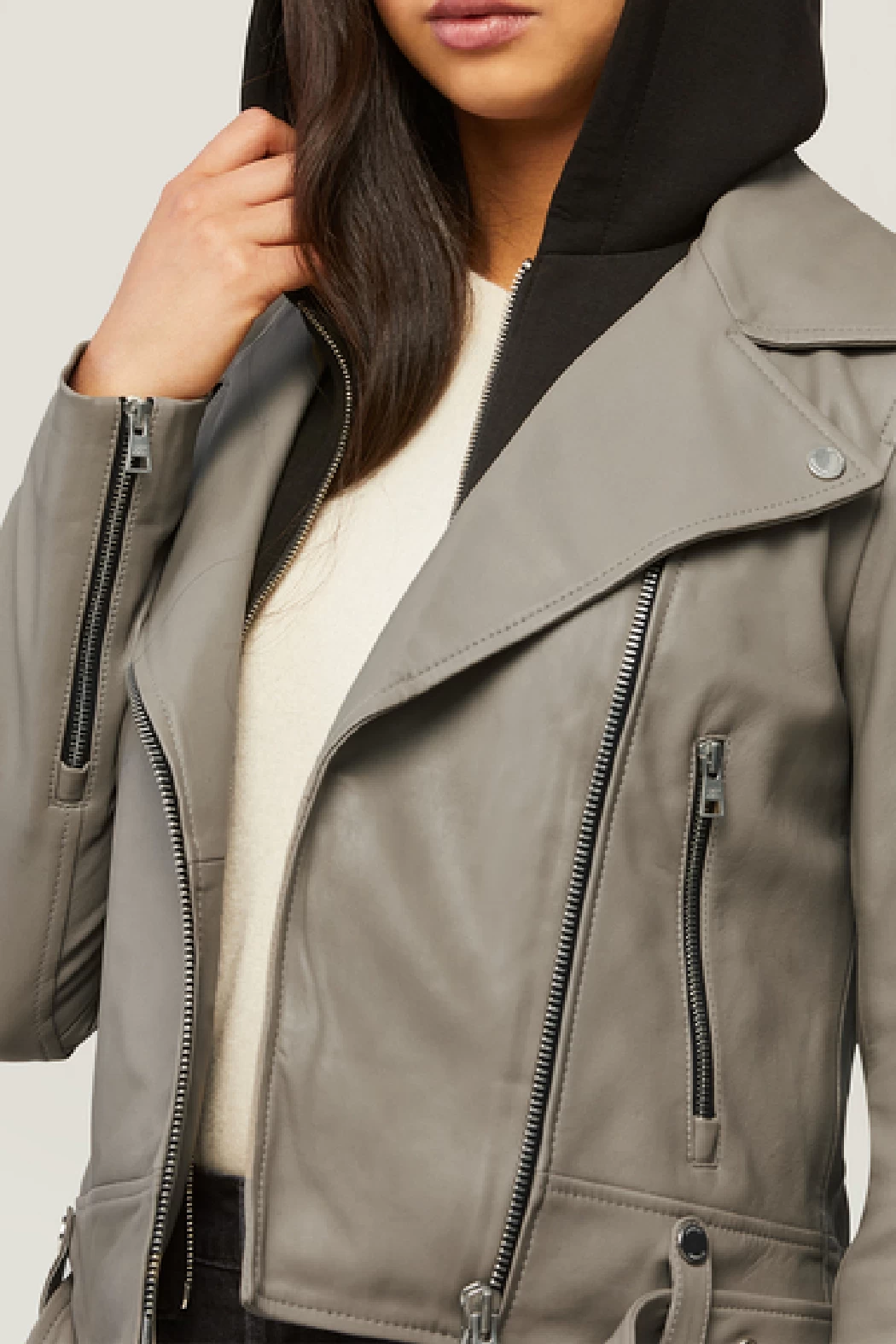 The ELISHA by SOIA & KYO is a classic moto jacket with a twist. This slim-fit, hip-length leather jacket can be worn multiple ways with its removable knit hood and bib and features a belt with a silver metal buckle and angled zipper pockets. Keep it closed with the asymmetrical zipper and enjoy the comfort of our stretch printed lining.