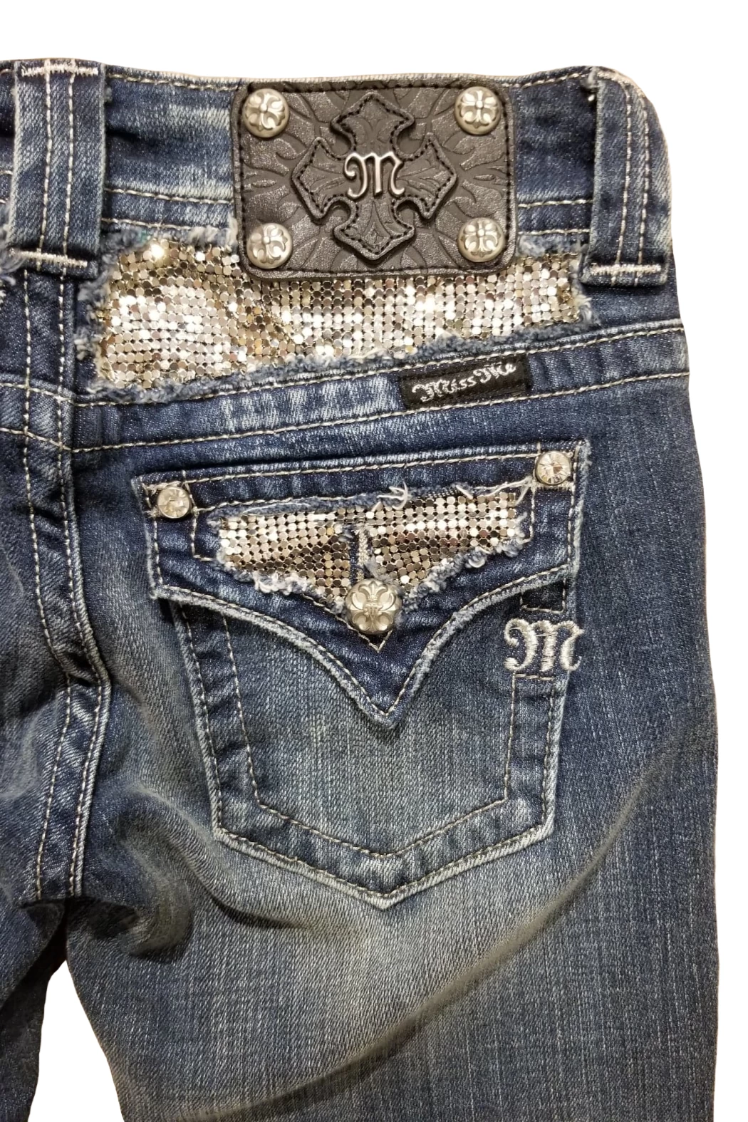 Flow right into glowing style with this must have skinny jeans featuring diamond inserts at flap pockets, embroidered detailing at yoke, whiskering, fading, contrast stitching, and a 5-pocket design. Inseam: “