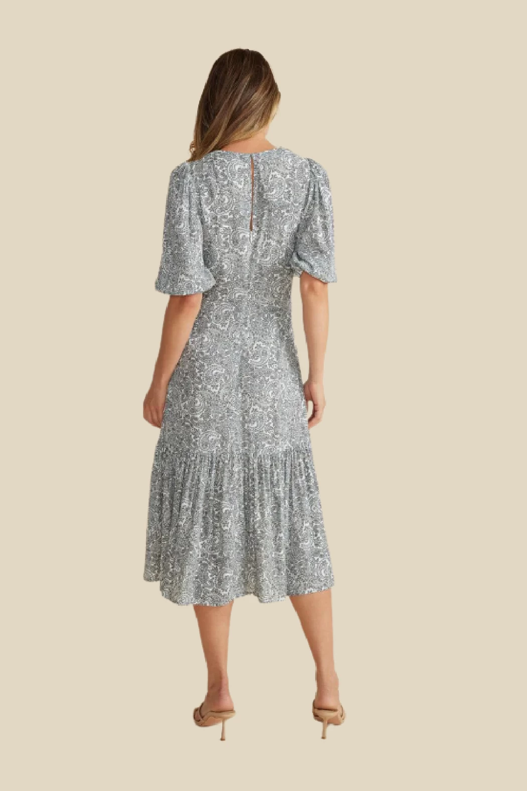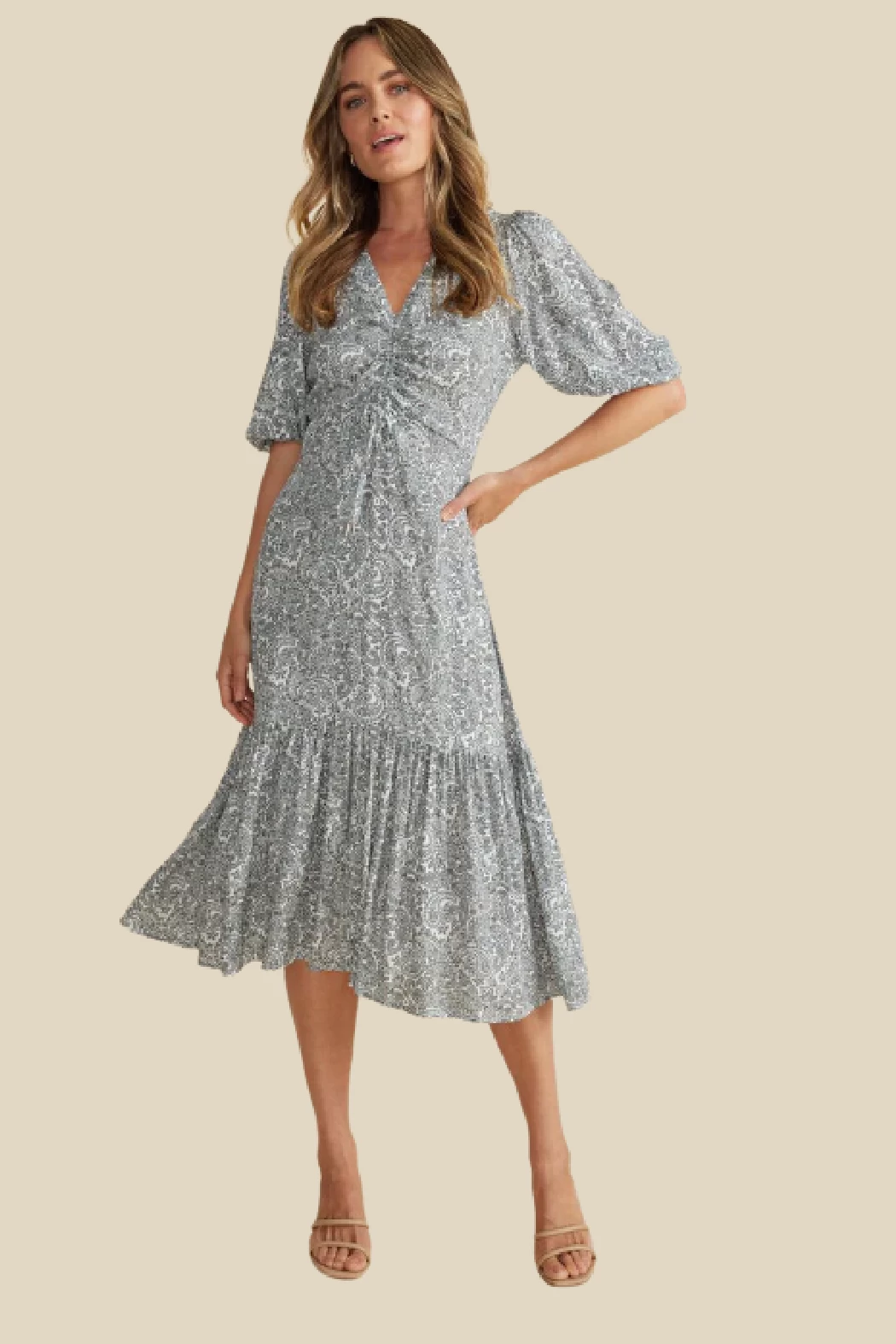 Featuring a drawstring ruched bodice, a V-neckline, billowing sleeves, and a gathered hem frill detail, the Harlow Midi Dress will turn heads. Crafted in a gorgeous paisley print, dress up with heels of pare back with sneakers.