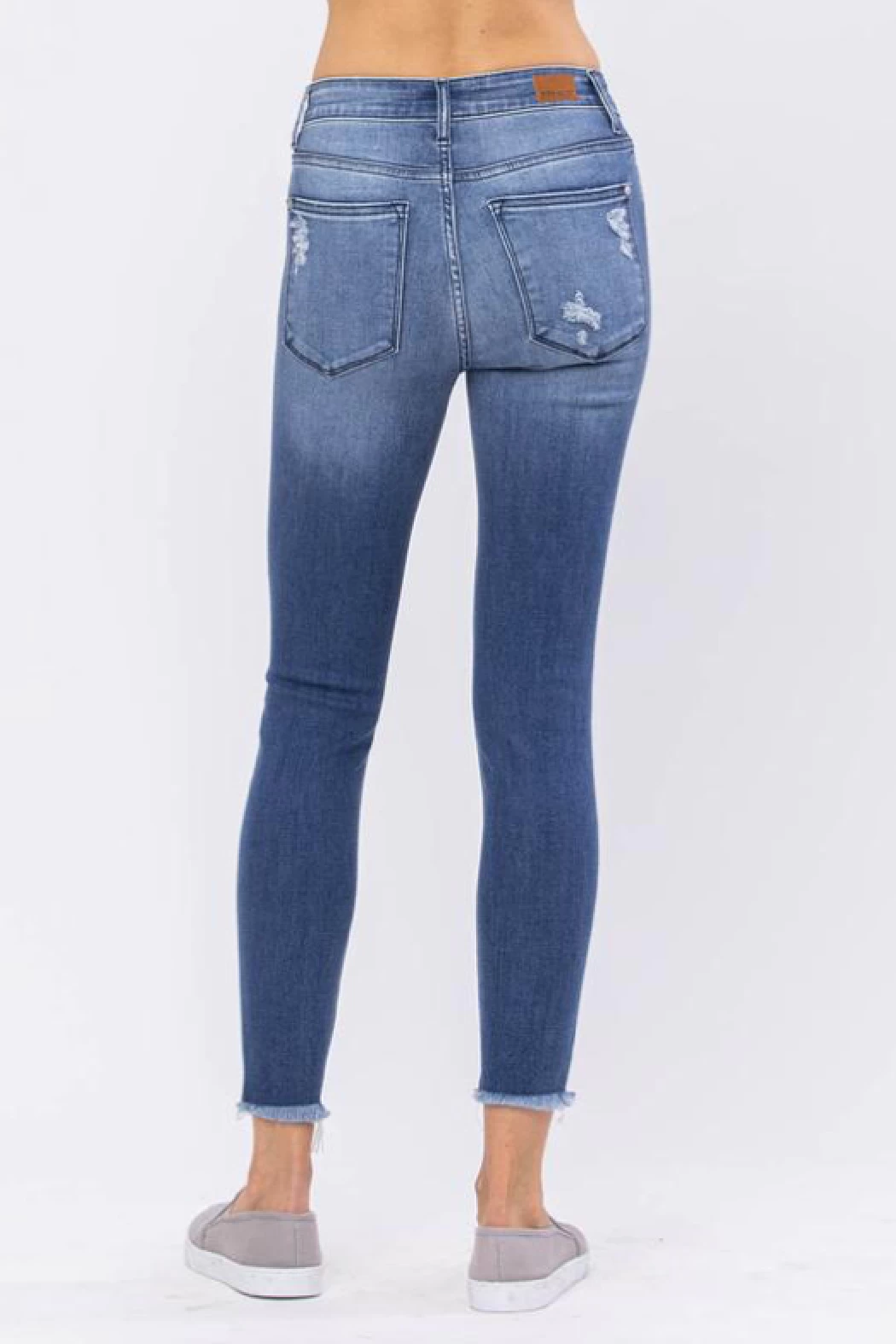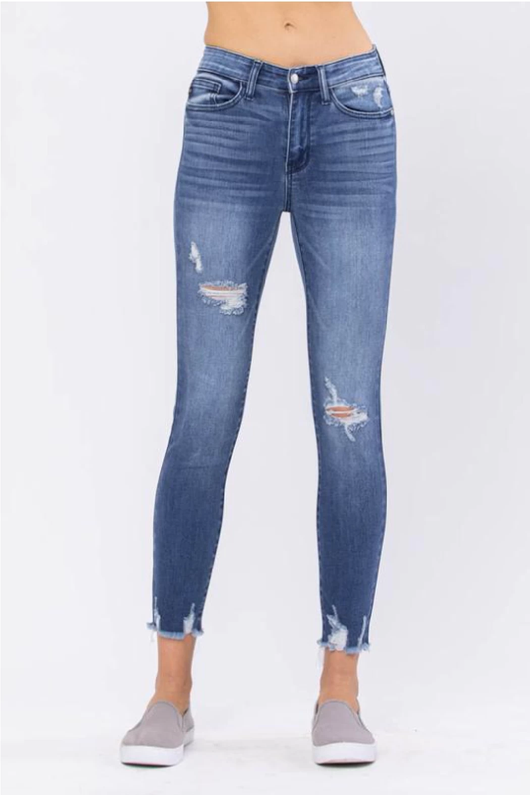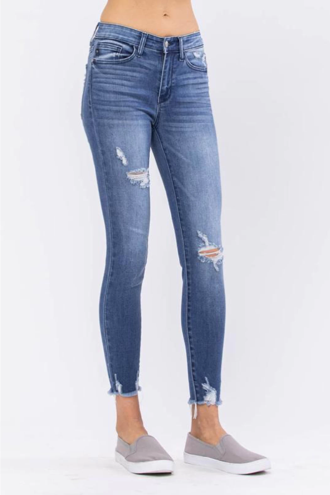 These amazingly soft and stretchy skinny jeans will soon become a staple in your closet! The perfect classic medium wash combined with a fun and stylish hem will have you dancing in joy once you try them on!