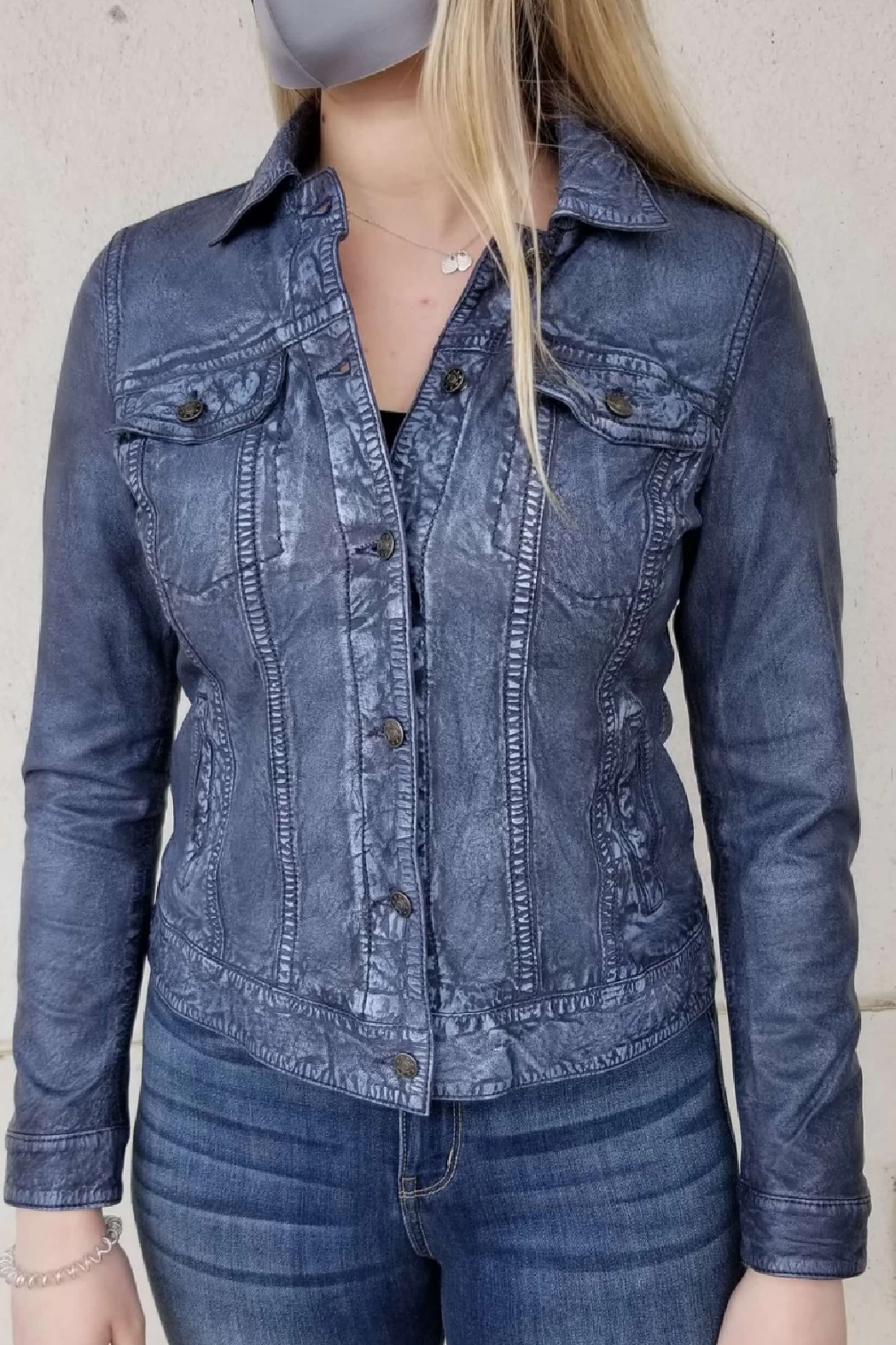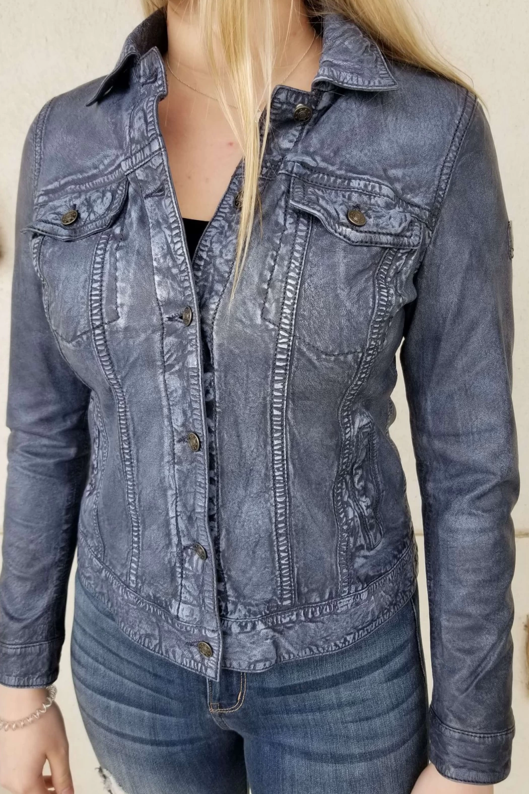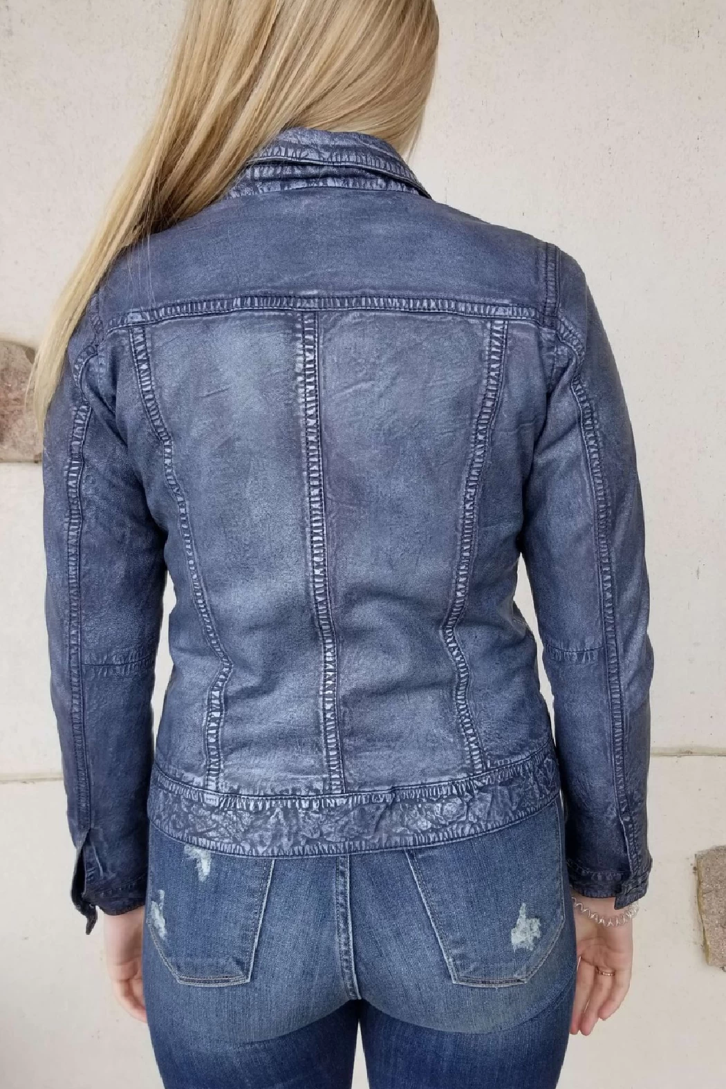 This beautiful leather, jean jacket features a front button closure, a distressed look with detailed stitching. Material does have some natural stretch. This garment runs very small in size, size up one size for a fitted look, and two sizes for a relaxed look.