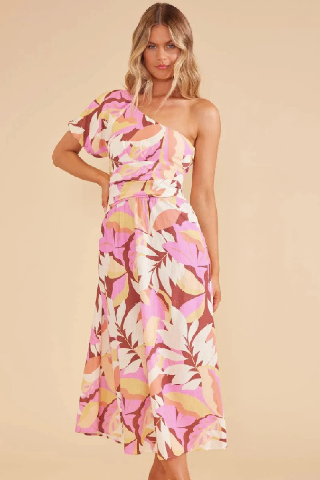 A feminine statement piece, the Kali One Shoulder Dress is adorned in a bold tropical floral print, featuring a ruched middle panel and asymmetrical hemline.