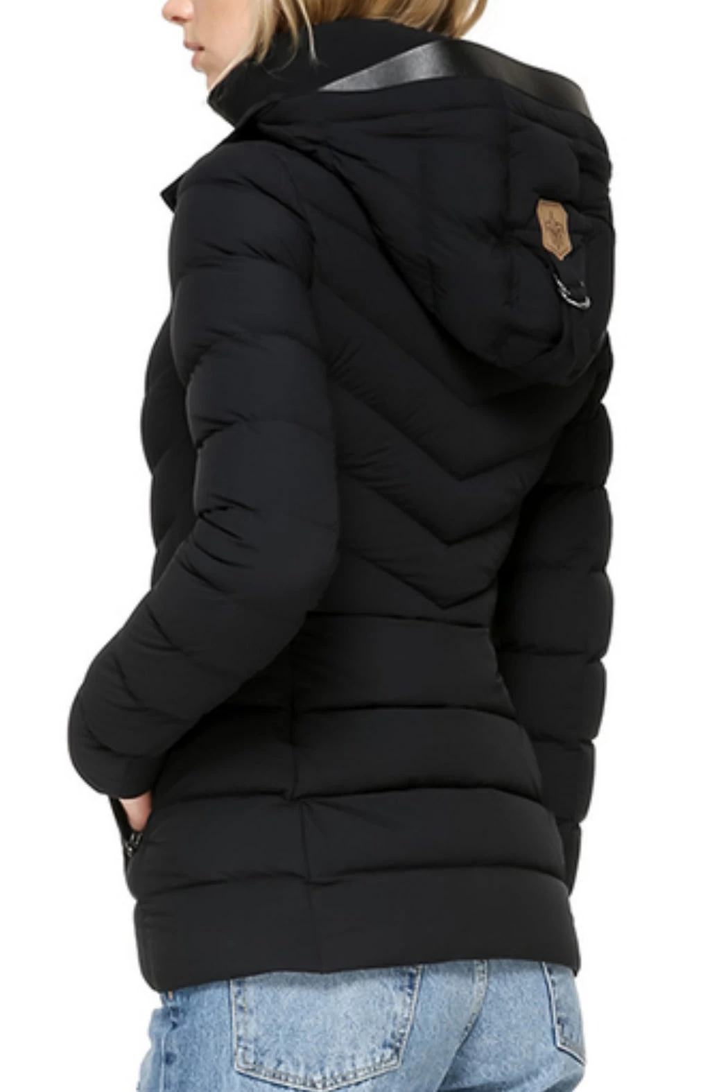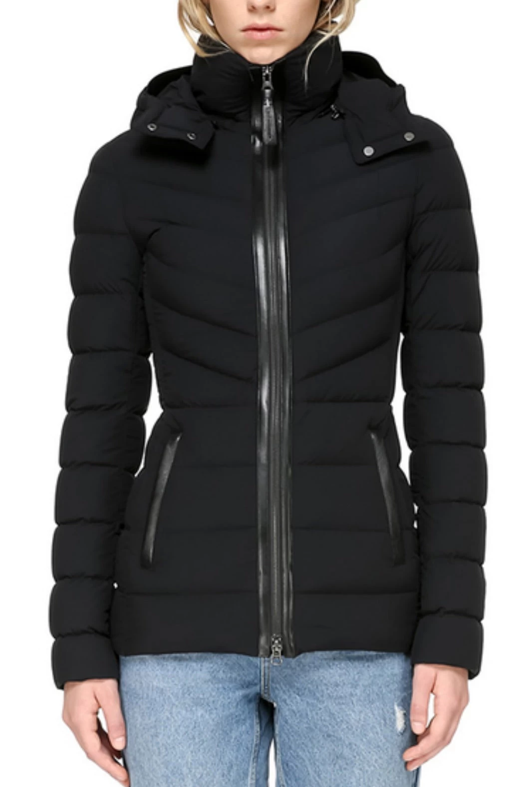 PATTI by MACKAGE is a waist-length, quilted, lightweight down jacket with a fitted silhouette and a removable hood for versatility. This down coat features leather trims, and a leather hood visor. Matte black hardware on all colorways. Available in black.