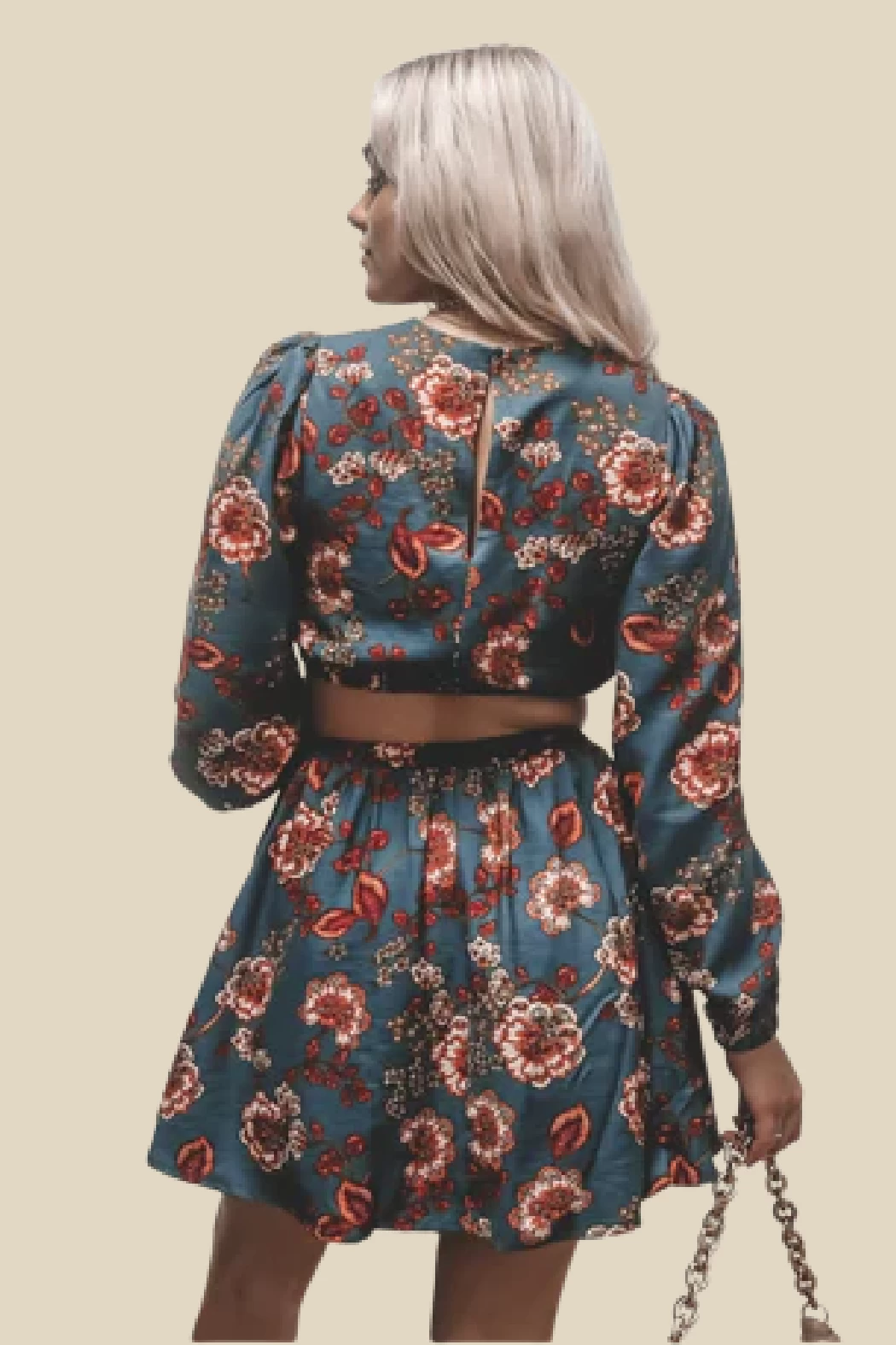 With a high neckline, puff sleeves, elasticated waist cutout details and self fabric covered ring, this is the perfect dress for a special event.