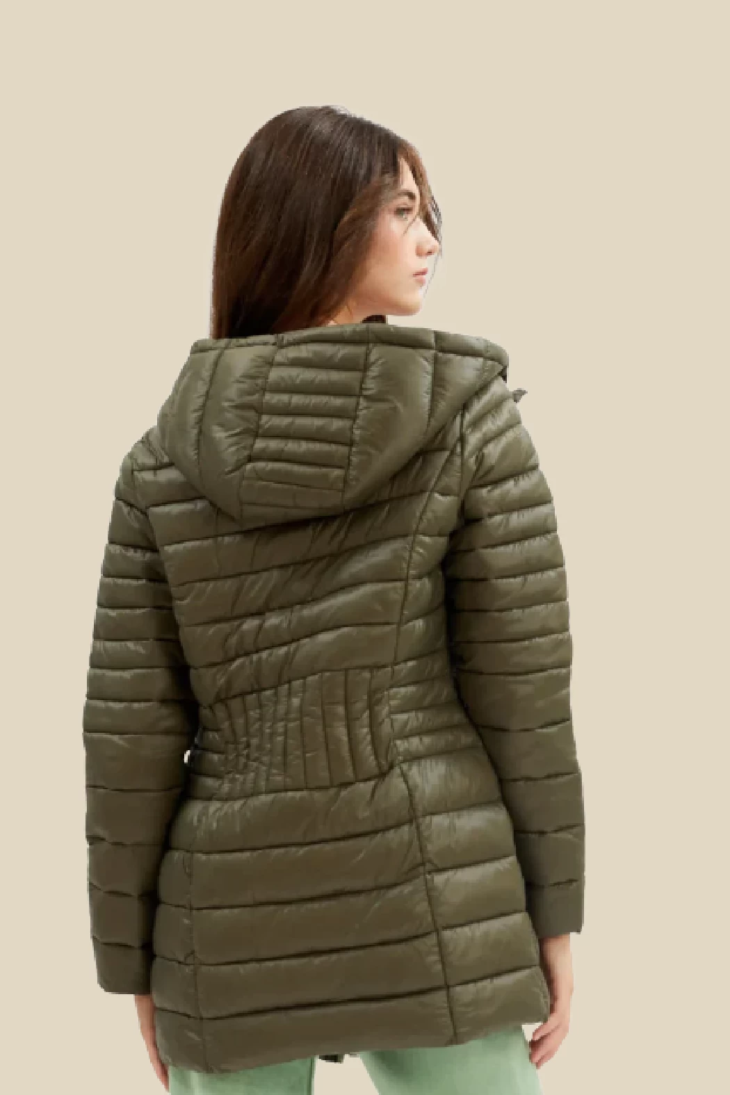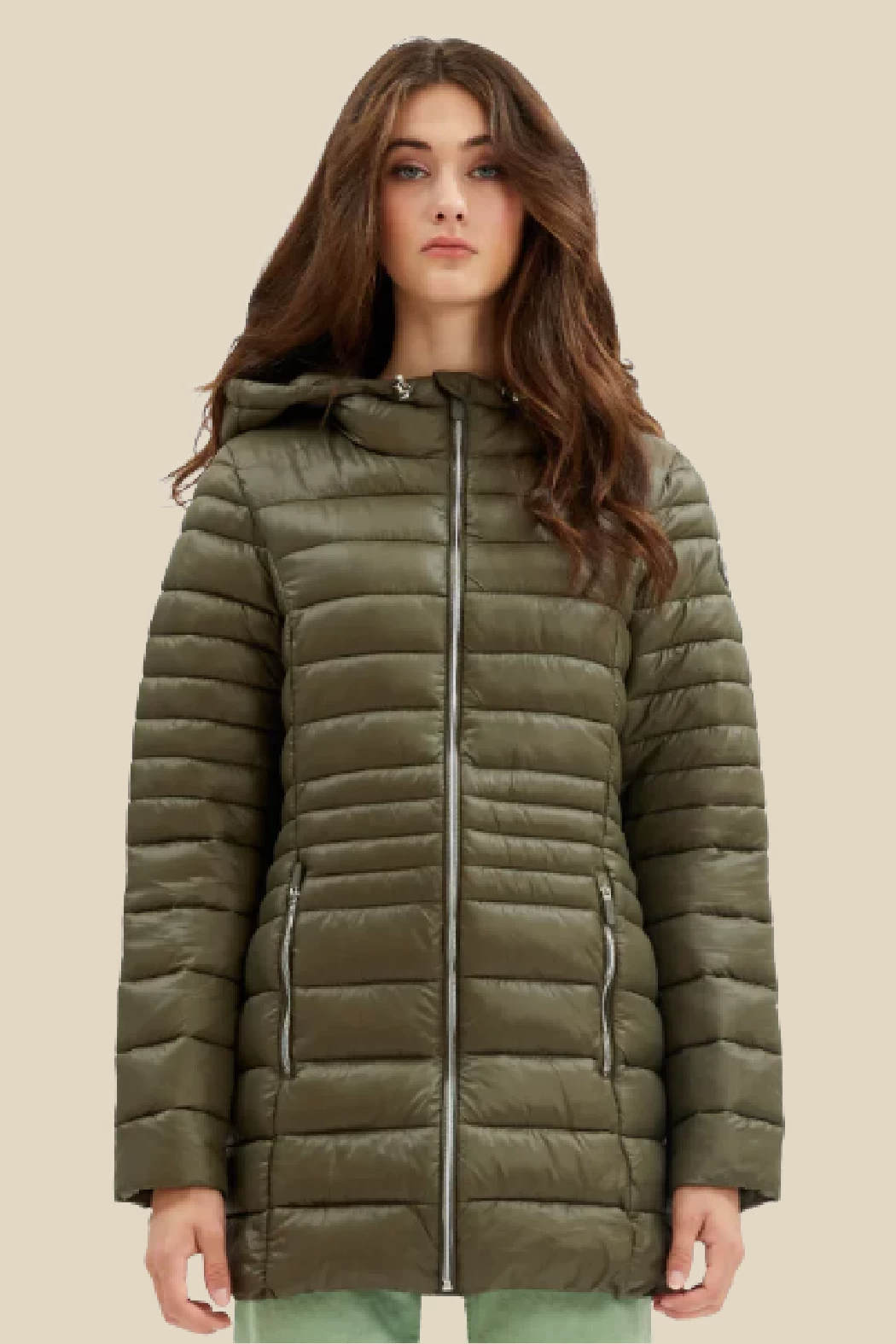 Iconic lightweight with straight cut quilted filled with eco down. Narrow quilting around waist to give it a feminine silhouette. Packable design into a neck pillow perfect for travelling. Nylon fabric generates heat giving you maximum for up to -5 degrees.