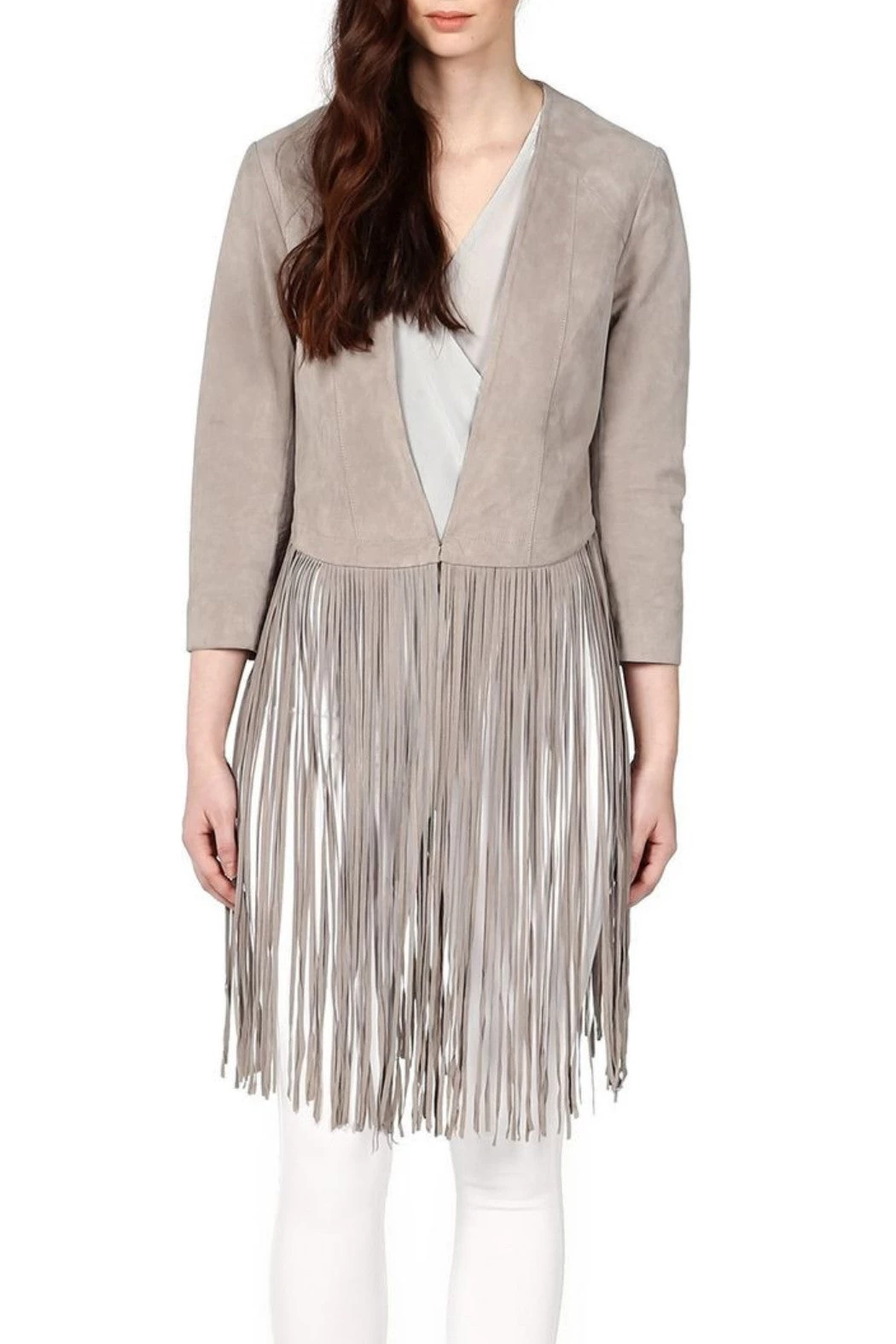 ROMIE by SOIA & KYO is a collarless jacket with flirty fringes running down the bottom. Crafted from supple suede, this modern piece falls above the hips for a flattering, slim fit statement piece. Modern silver hardware complete this flowing look.