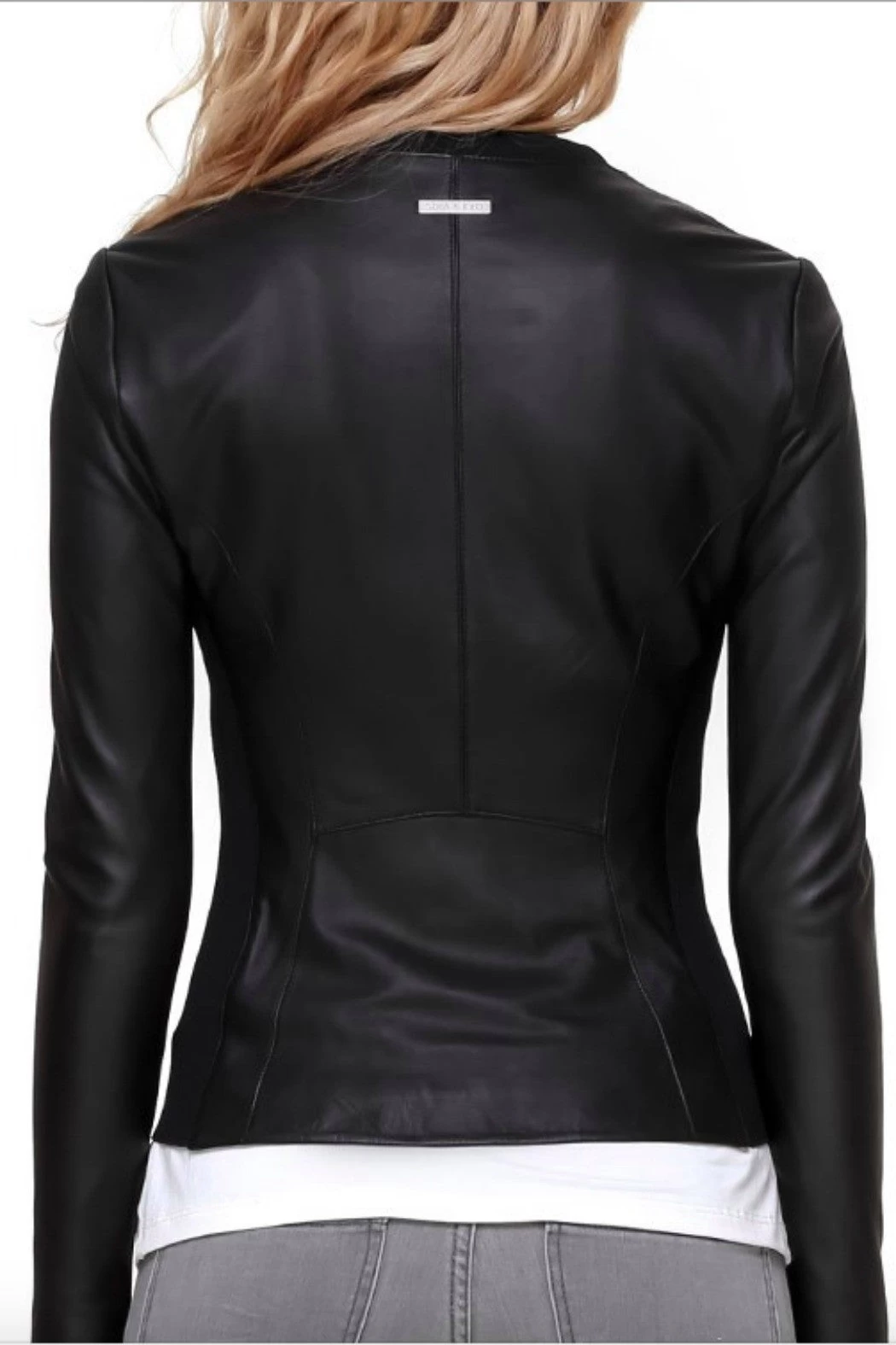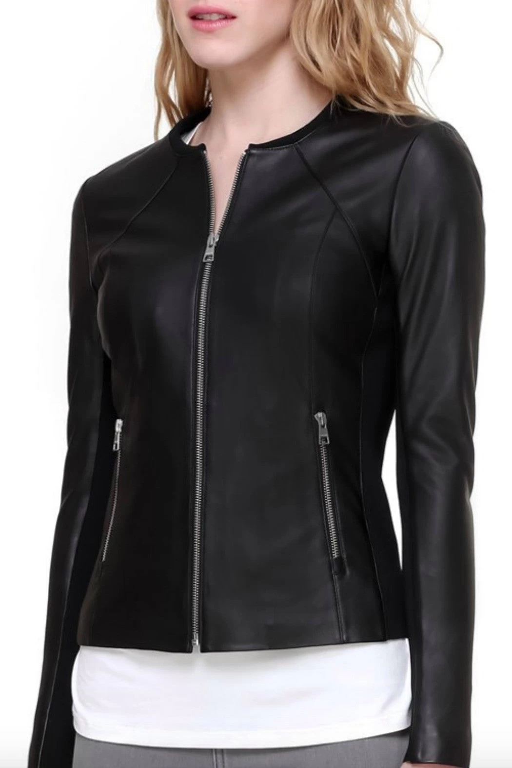 RYLEE by SOIA & KYO is a slim-fitting leather jacket with silhouette-enhancing rib knit side panels. Its clean lines and minimal construction make it one of the seasonÍs most versatile pieces, whether worn as a pretty and practical layering piece or as an updated spin on the classic the blazer.