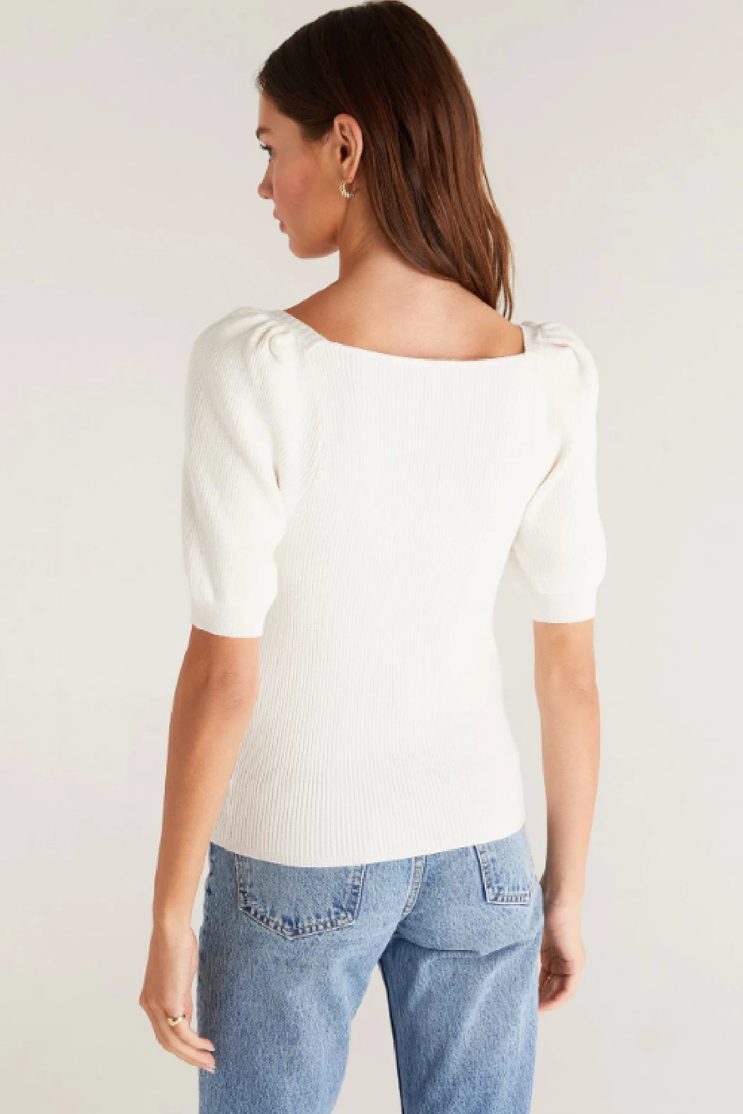 We’re into feminine silhouettes this spring. The Sibyl Short Sleeve Sweater Top is made using our new rib fabric and features a square neckline, slimming body that can be worn tucked or untucked, and slight puff sleeves. Pair it with denim for an easy romantic look.